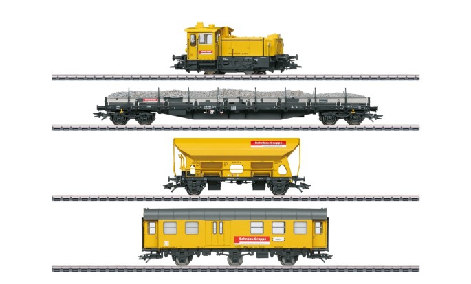 Der Niederbordwagen des Typs Res mit Alu-Bordwänden ist mit Schotter beladen und auch der Selbstentladewagen besitzt eine imitierte Schotterladung. Außerdem ist ein Aufenthalts- und Werkstattwagen des ehemaligen Typs BDg3y in Set enthalten.